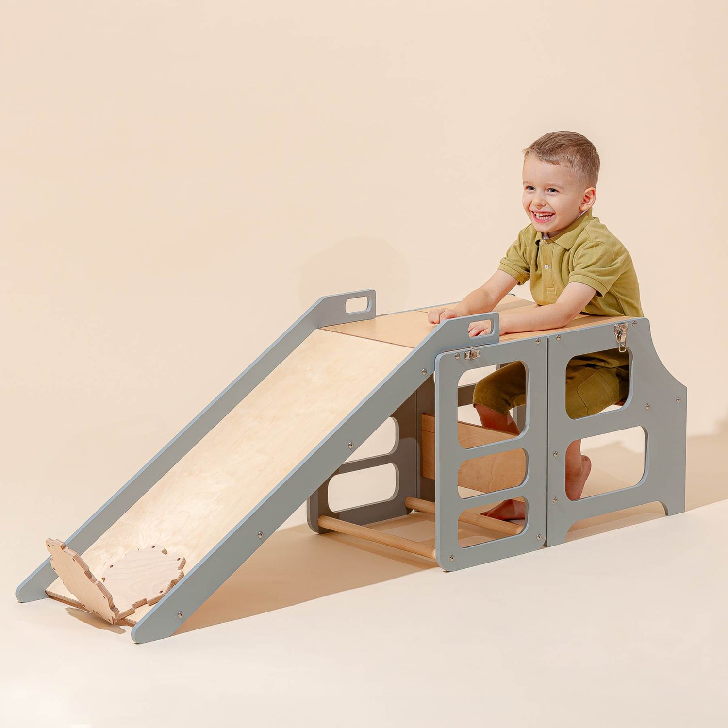 Un triangle d'escalade avec toboggan ouvrira de nouvelles perspectives et permettra de s'amuser en l'utilisant. Par exemple, l'enfant peut l'utiliser comme jouet d'escalade, toboggan, circuit de course pour voitures ou même comme château une fois recouvert d'une couverture.
